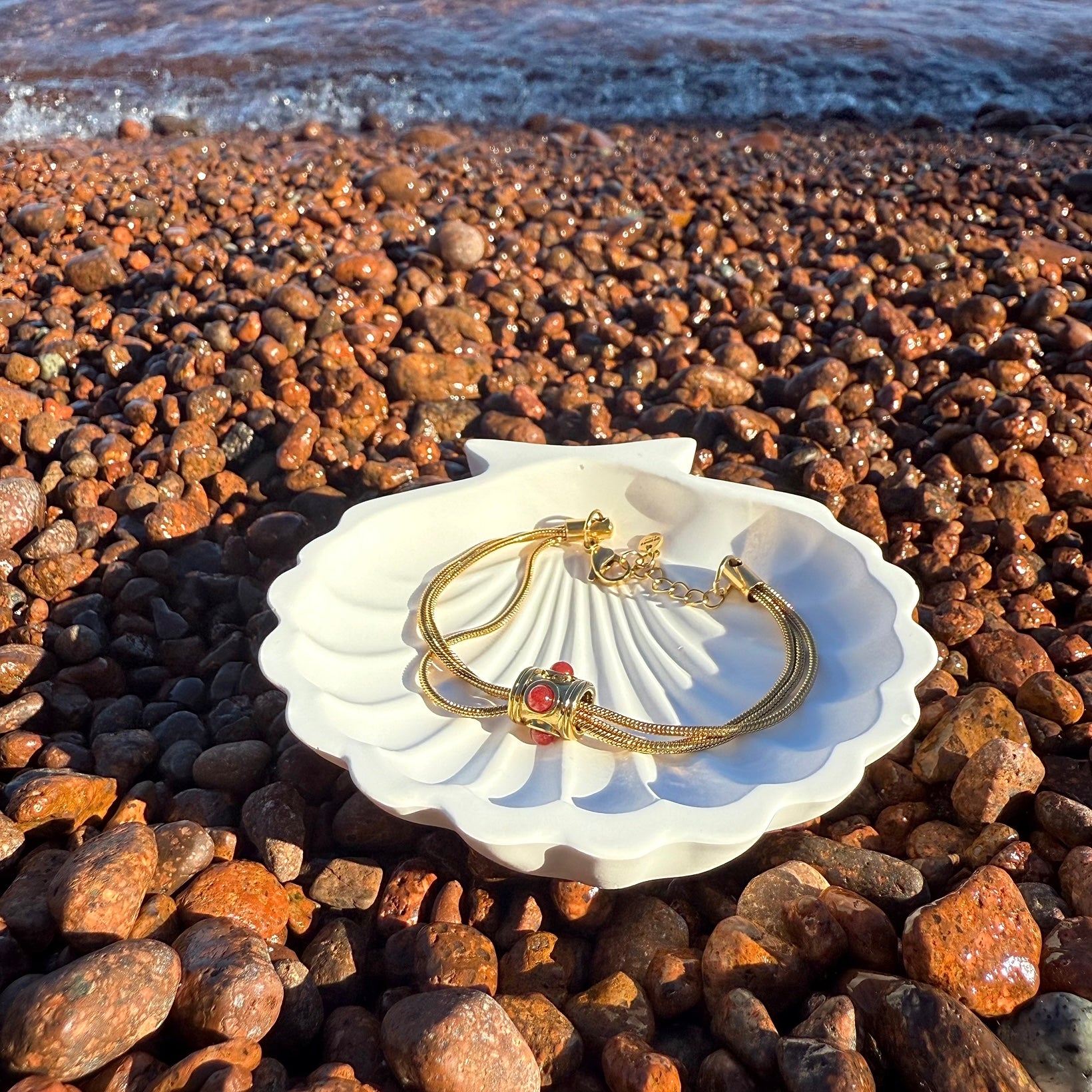 Le bracelet Ella est une pièce délicate et féminine, pensée pour ajouter une touche de couleur et de lumière à ton poignet. Son design raffiné associe plusieurs chaînes fines dorées à un joli élément central orné de petites pierres colorée, ce qui lui donne une allure élégante et légèrement bohème.