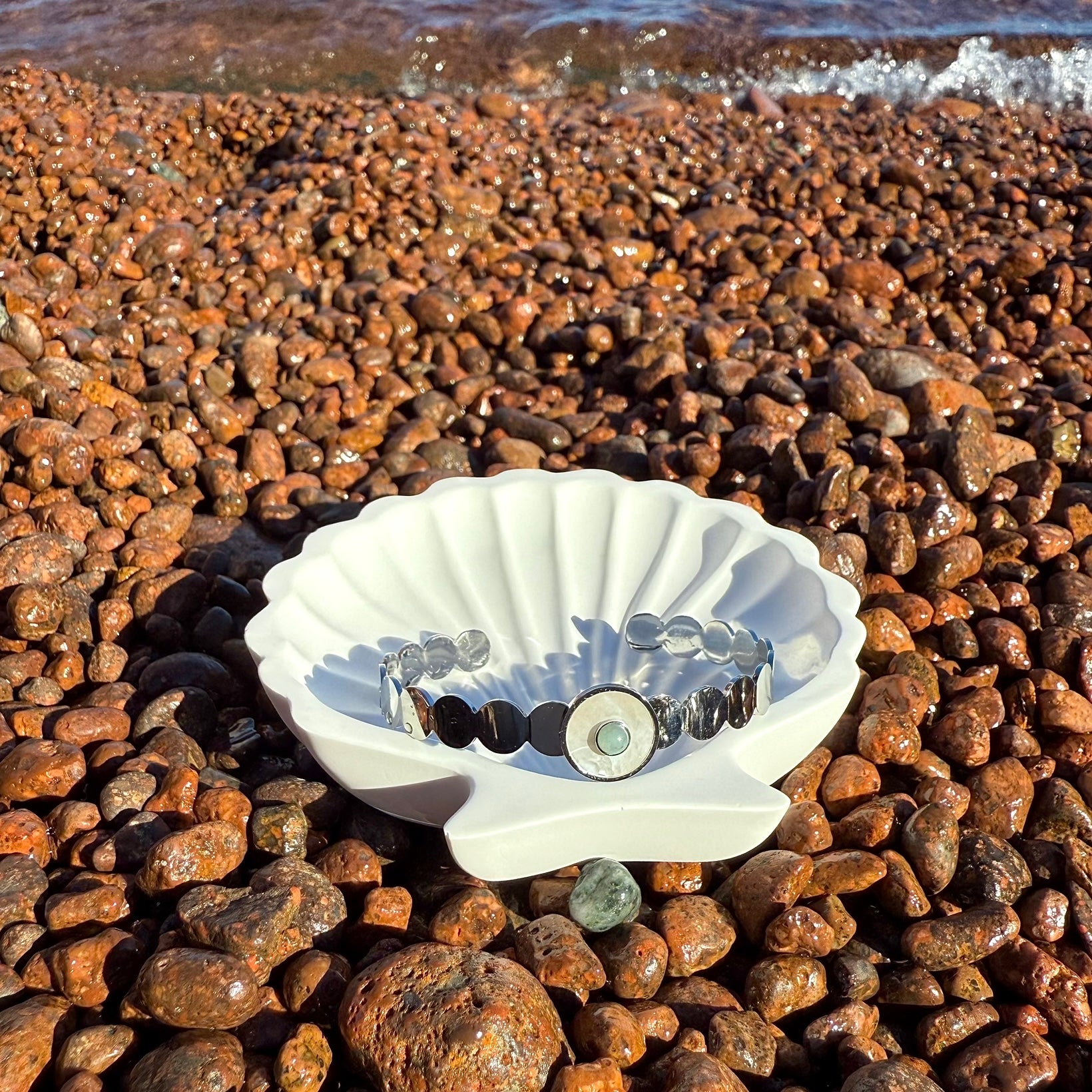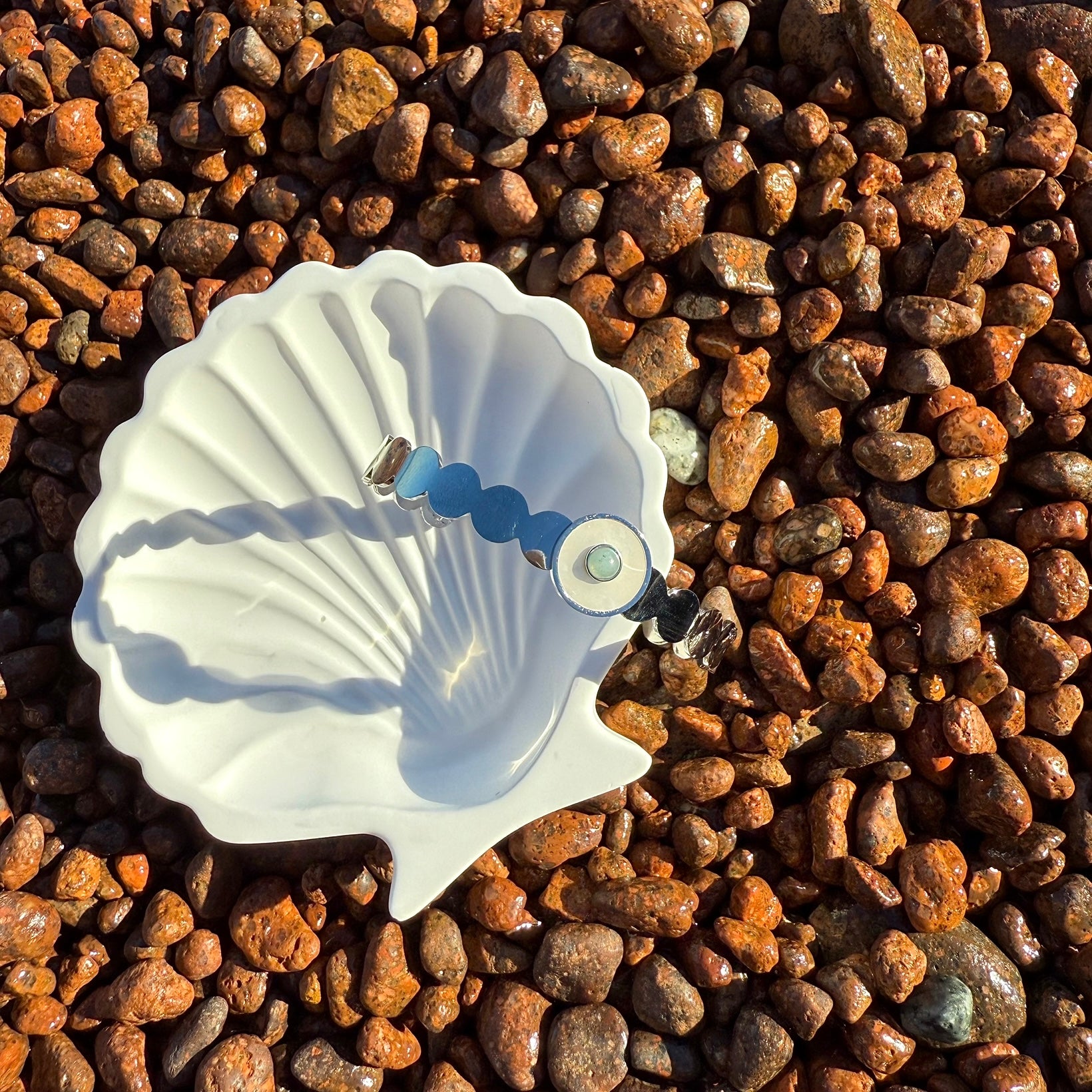 Le jonc Hélié est une pièce lumineuse et moderne, inspirée des reflets du soleil sur l’eau. Son design fin et graphique alterne de petites pastilles métalliques et un médaillon circulaire rappelant un halo solaire, sublimé par une pierre synthétique irisée en son centre.
